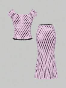 Kawaii Set de top y falda ajustada con cuello en V, decoración de moño, contraste de lunares y encaje parche