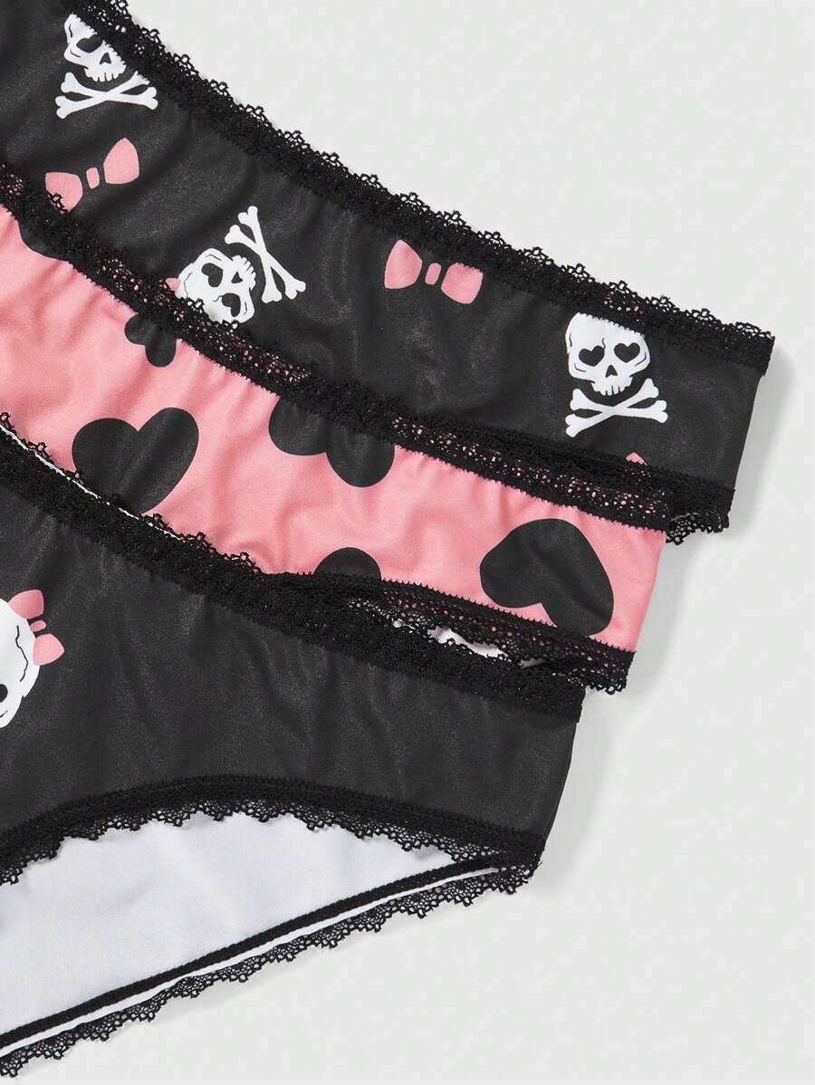 Kawaii 3 Piezas Braguitas Con Estampado De Calavera Y Corazón Con Ribete De Encaje