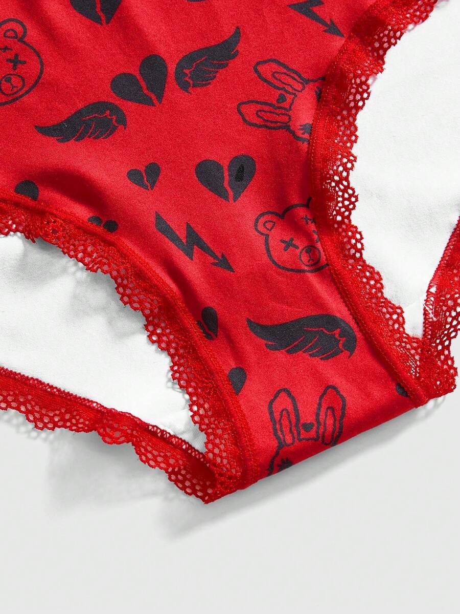 Kawaii Set de 3 bragas de mujer con parches de encaje, diseño de oso y corazón con alas