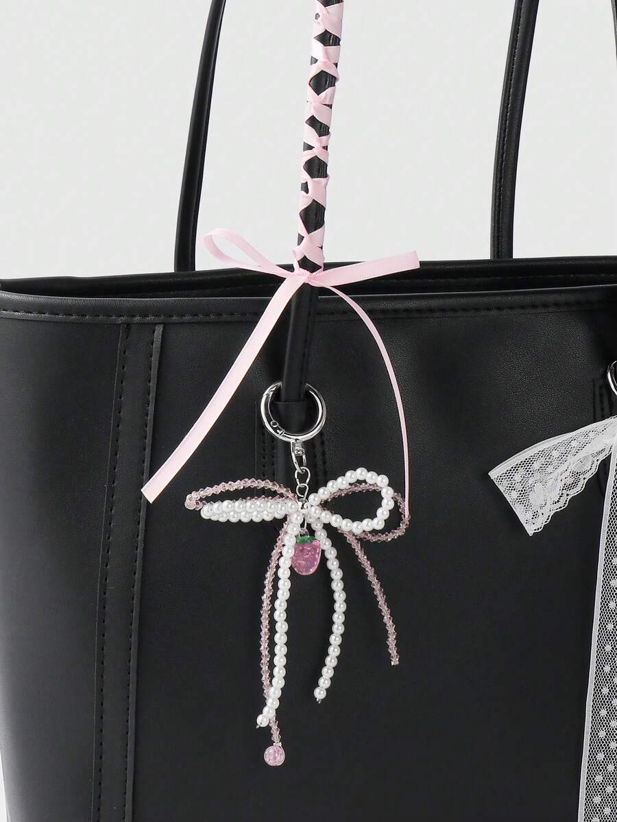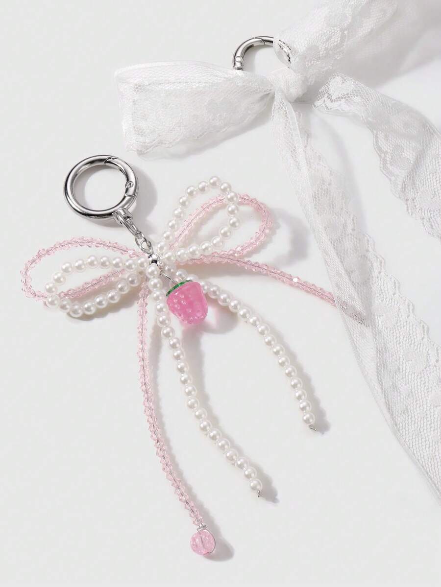 Kawaii Set de regalo de 3 piezas en estilo coreano minimalista y elegante: Colgante de mariposa y fresa con perlas artificiales y cristales, lazo floral de corazón hueco y lentejuelas, llavero de cuerda rosa de 200cm para mujer/niña