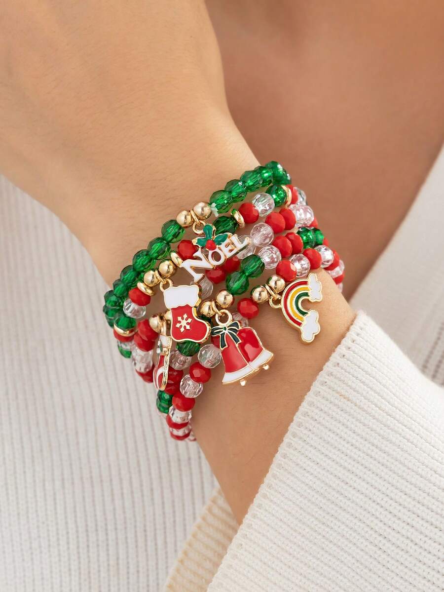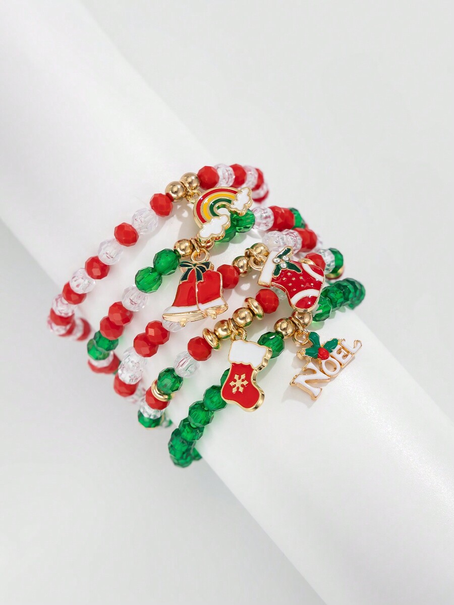 Kawaii Set de 5 piezas de pulseras navideñas lindas, que incluye: campana de Santa, calcetines arcoíris, colgante de dibujos animados y pulsera con cuentas de cristal