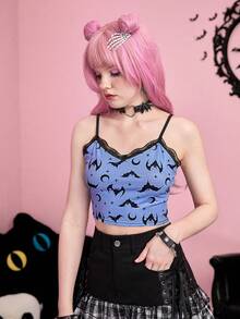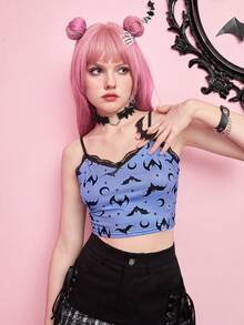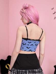Kawaii Top de tirantes con estampado de murciélago con encaje en contraste