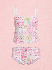 Kawaii Set de lencería con estampado de dibujos animados ribete en forma de lechuga