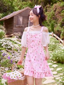 Kawaii Vestido pichi con estampado de dibujos animados bajo con fruncido