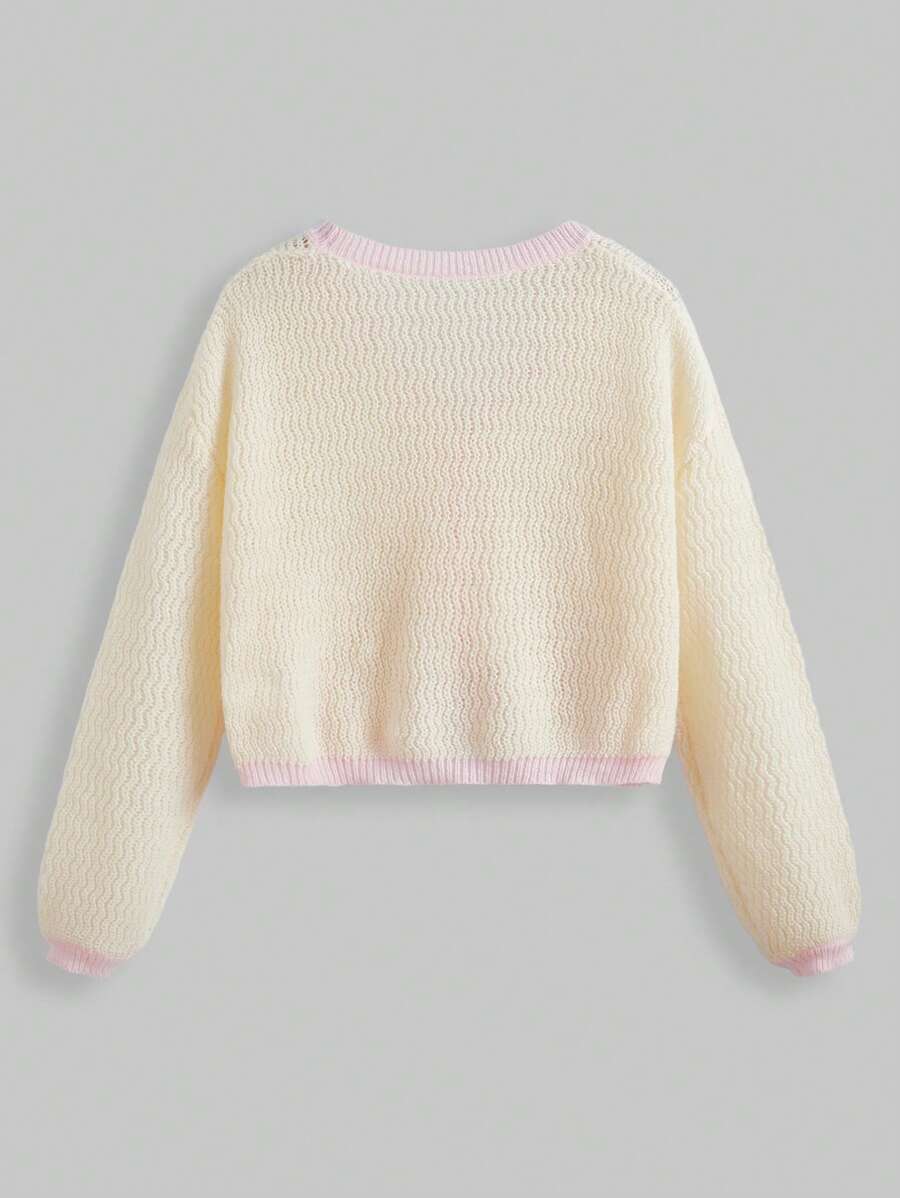 Kawaii Cárdigan con bordado de cereza de hombros caídos con parche de bolsillo