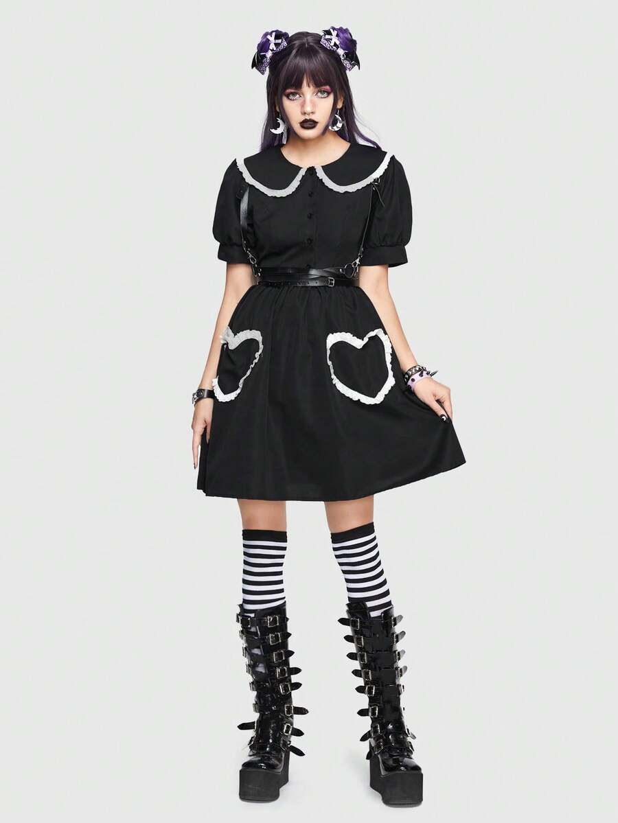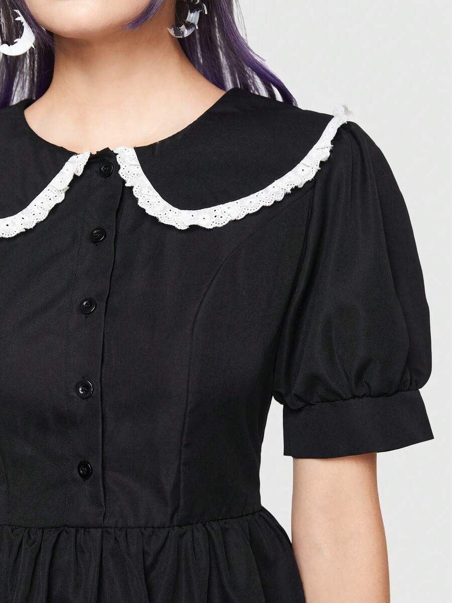 Kawaii Vestido unido en contraste de cuello exagerado de manga farol sin cinturón