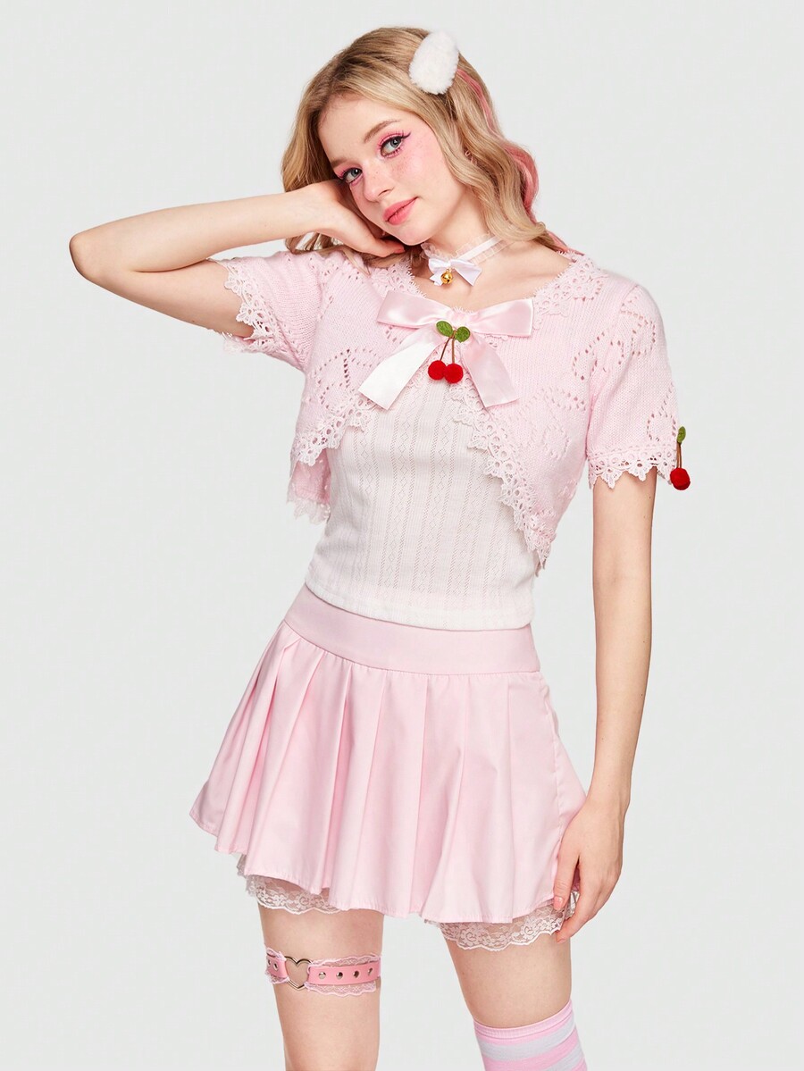Kawaii Top crop con encaje en contraste de manga farol con lazo delantero bajo con fruncido