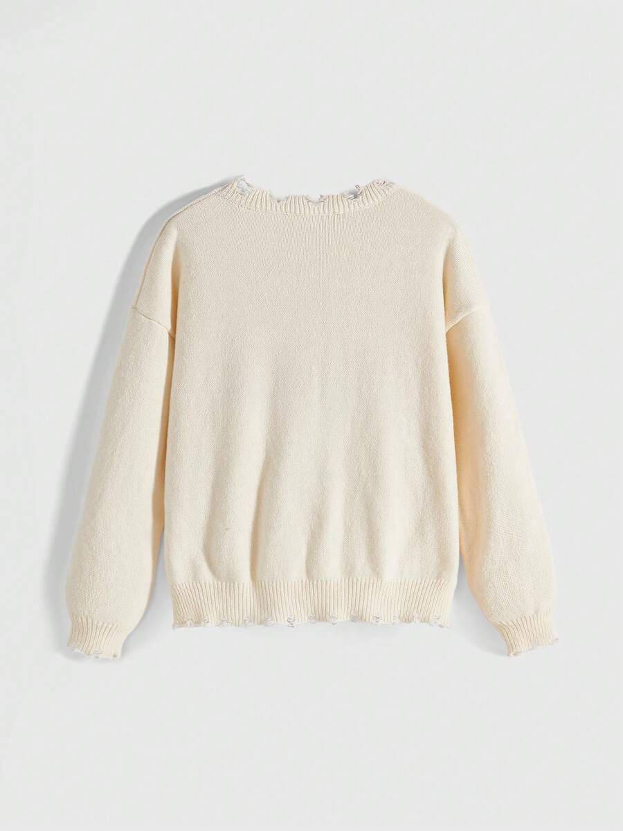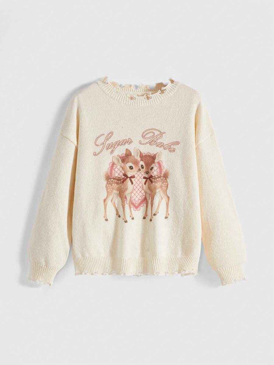 Suéter de niña kawaii y cute con estampado de corazón de ciervo en estilo Y2K, versión holgada y asimétrica desgastada, suéter casual para mujer, adecuado para la escuela, reuniones, uso casual, suéter dulce de Navidad