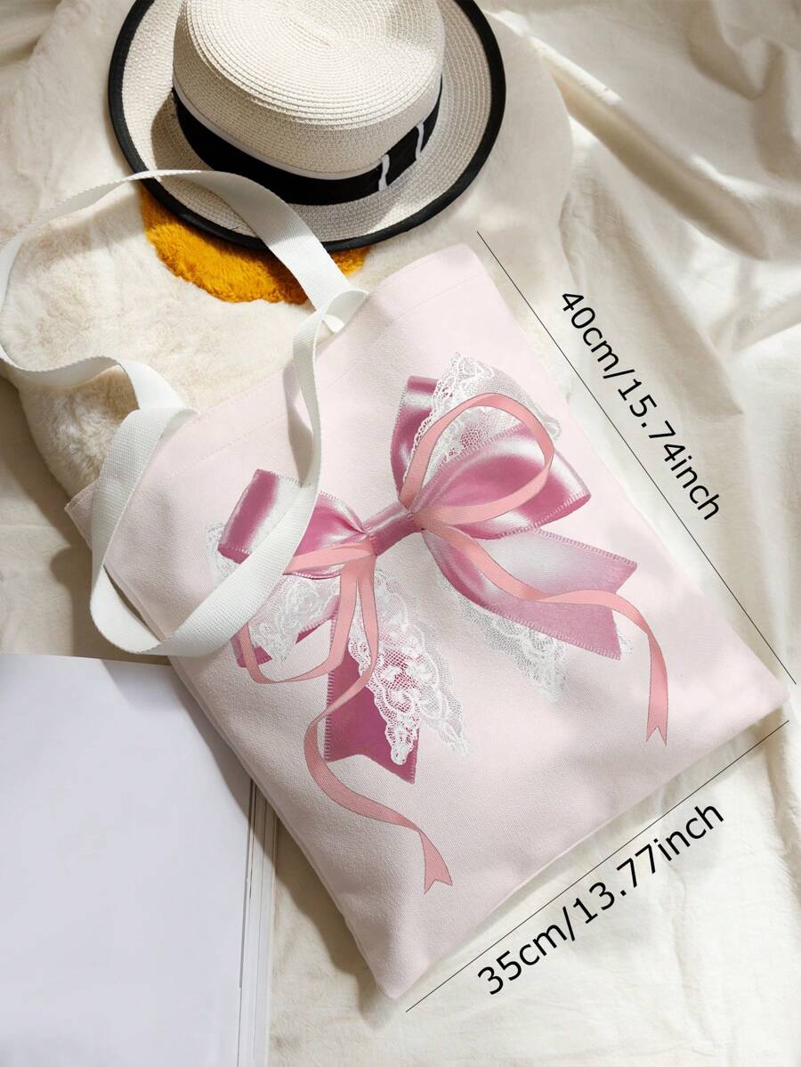 Kawaii Bolso de lona con asa de hombro con estampado de moño rosa impreso a doble cara
