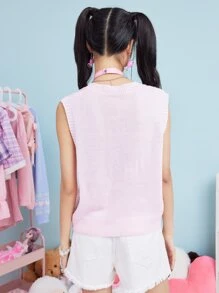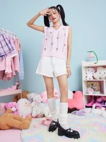 Kawaii Chaleco de punto con bordado floral tejido de cable