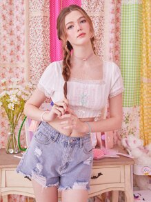 Kawaii Top corto con bordado de flor ribete con encaje