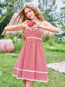 Kawaii Vestido de tirantes con estampado de guingán con encaje en contraste