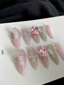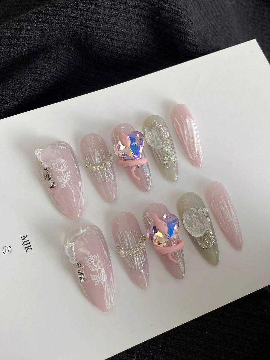 Kawaii (en Stock) 10 Piezas De Uñas Postizas Largas Con Diseño De Serpiente Rosa Incluye Pegamento De Gelatina