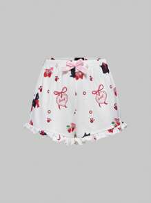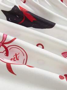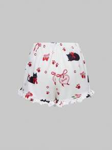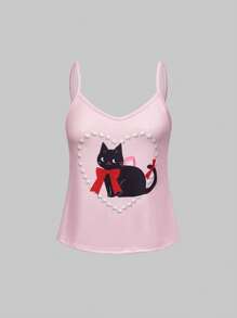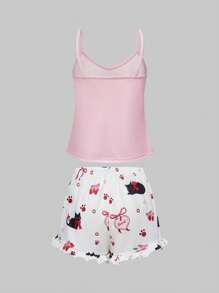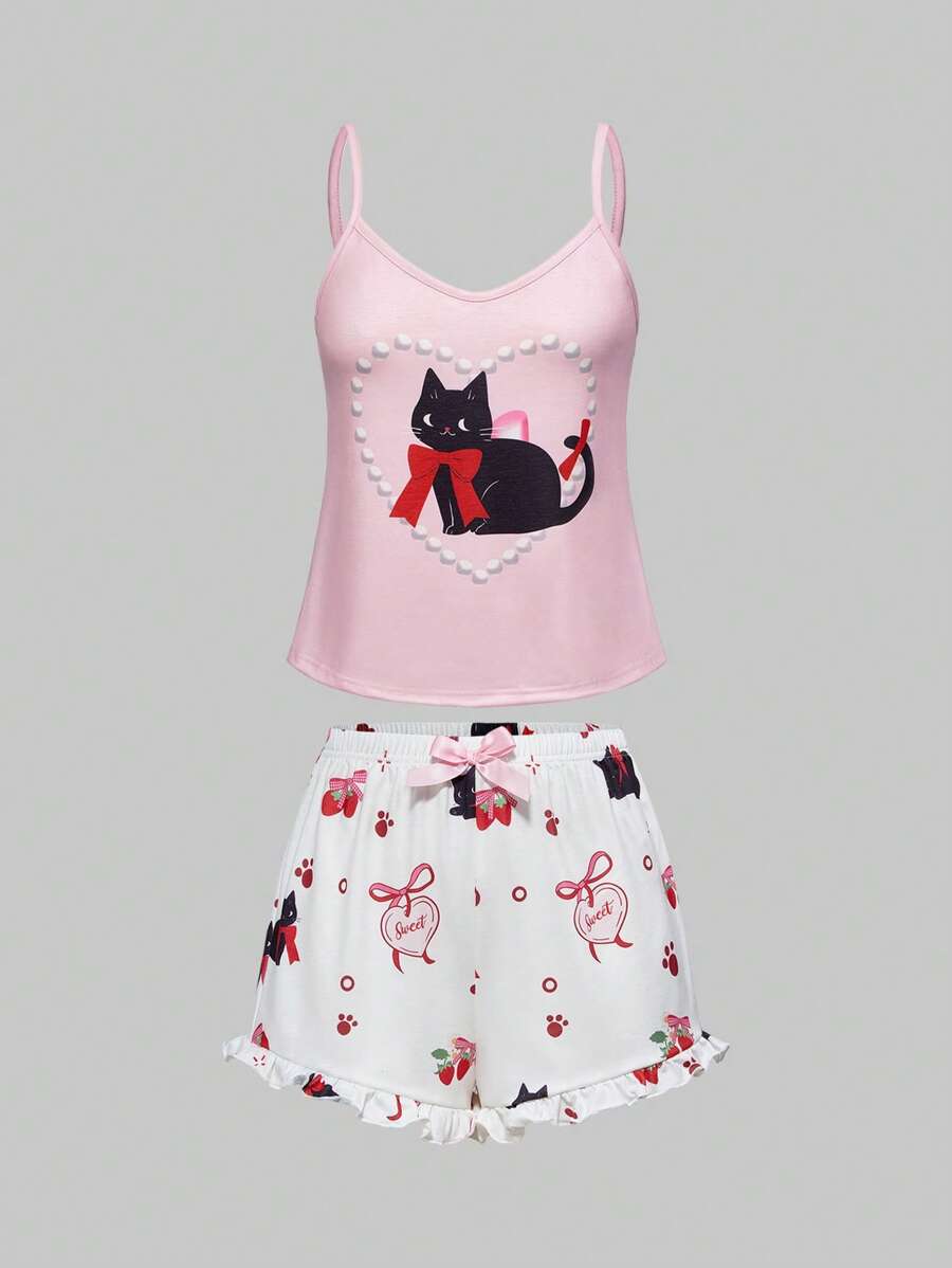 Conjunto de pijama casual de camiseta de tirantes y shorts con volantes, decoración de lazo y estampado de gatos kawaii para mujeres en verano