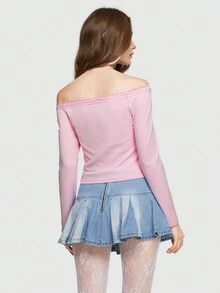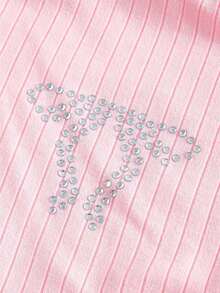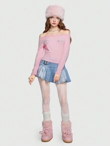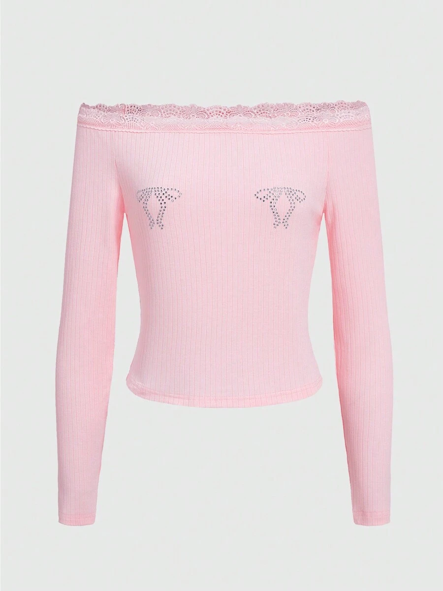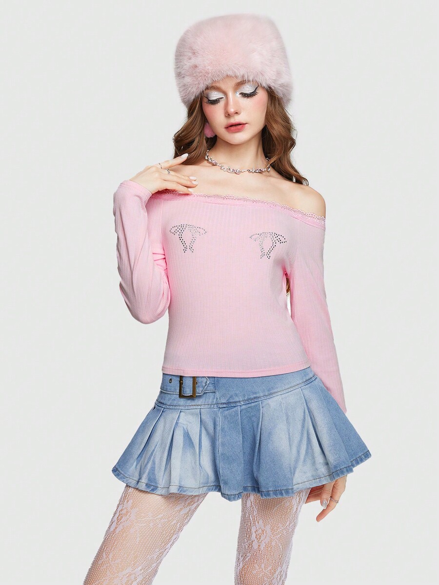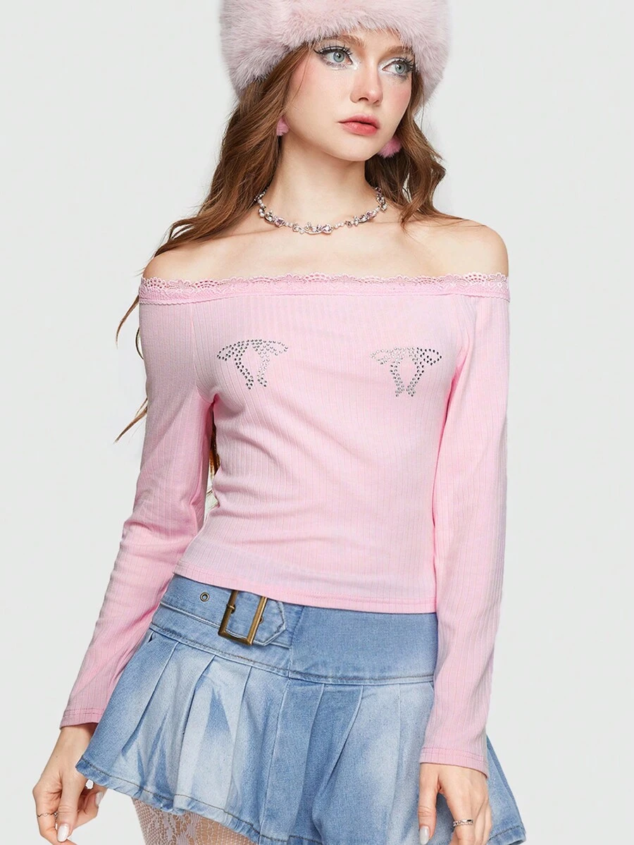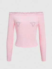 Kawaii Camiseta de hombros descubiertos ribete con encaje con diamante de imitación con patrón de mariposa