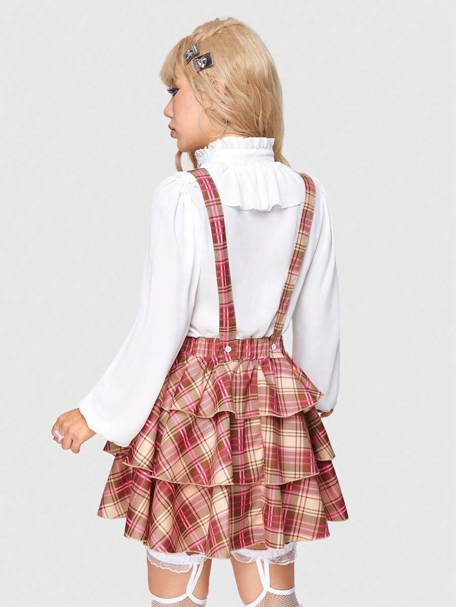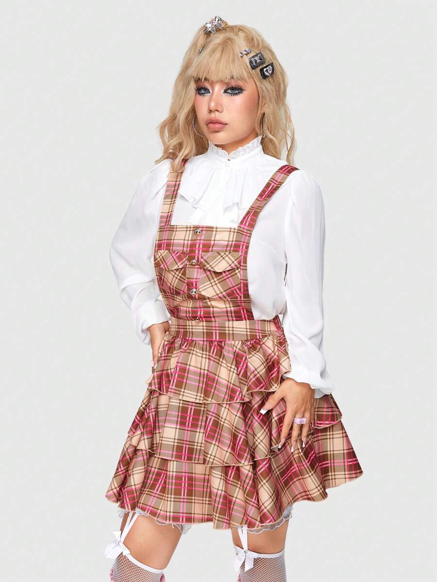 Kawaii Vestido De Tirantes Con Estampado De Cuadros En El Dobladillo Del Vestido