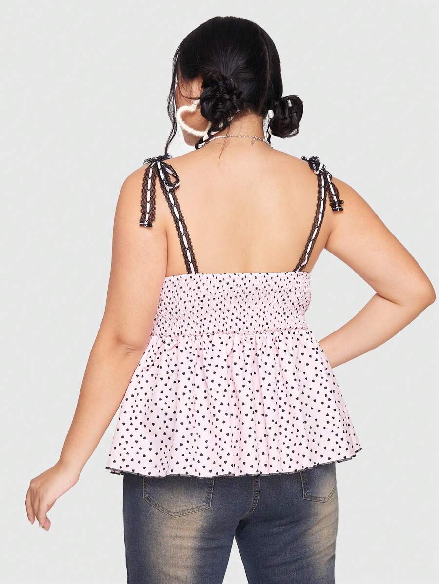 Kawaii Parte superior tipo camiseta con estampado de corazones en todo el diseño, con ribete de encaje, decoración de moño en los hombros y talla grande, para la escuela