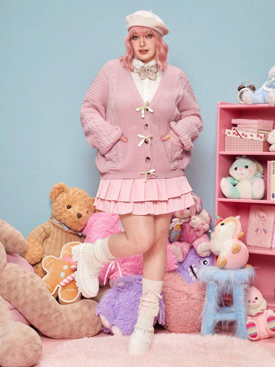 Kawaii Talla grande Cárdigan tejido de cable de hombros caídos con lazo delantero