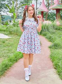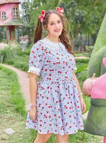 Kawaii Talla grande Vestido con cereza & con estampado de guingán de cuello bobo