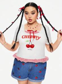 Kawaii Camiseta de manga corta con volantes, estampado de flores de cereza y cuadros, talla grande, para verano