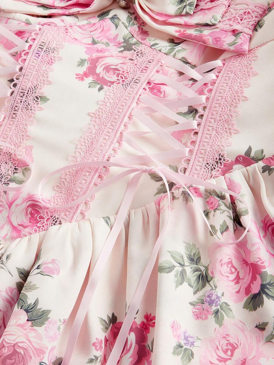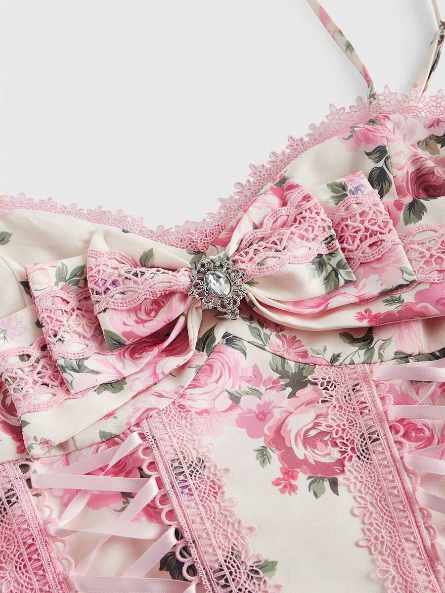 Kawaii Vestido mini de encaje con parches, de estilo vintage palaciego y floral ditsy, con lazo para mujer talla grande; vestido de corsé para mujeres