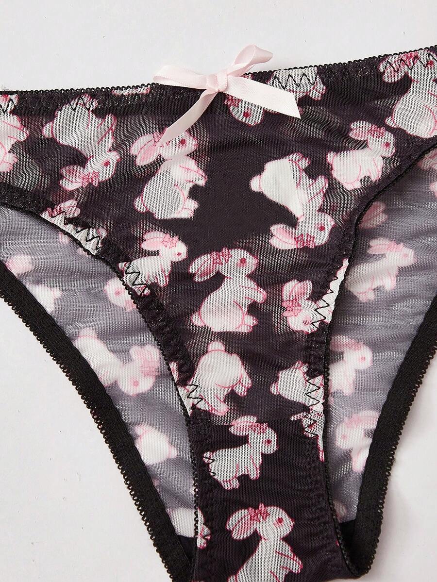 Kawaii Set de lencería con estampado de conejo con diseño de lazo de malla