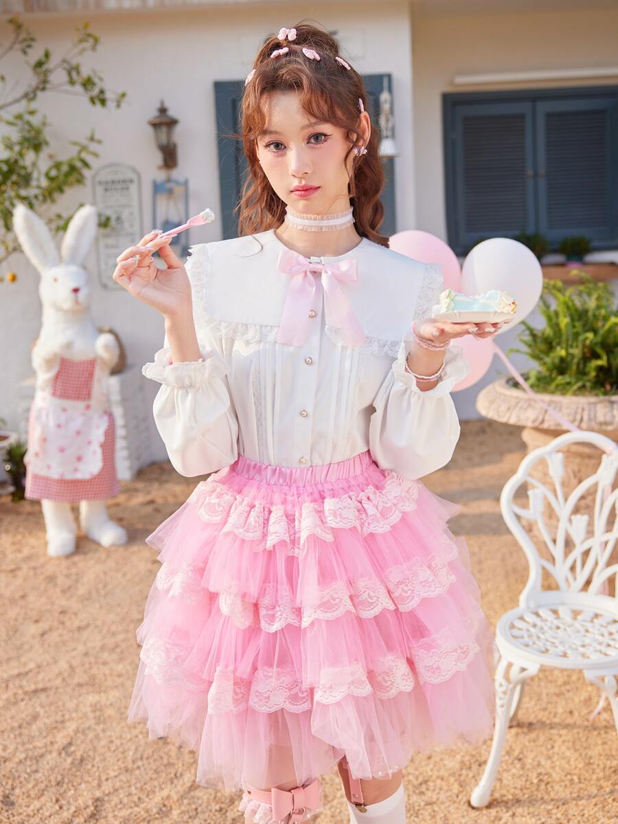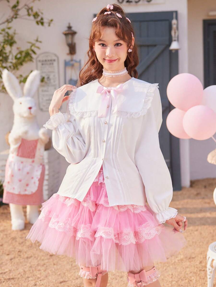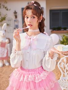 Kawaii Camisa cuello marinero ribete fruncido con lazo delantero de manga con volante