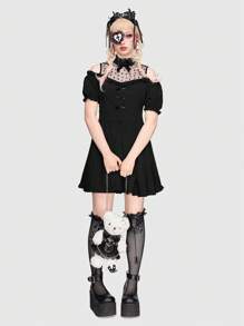 Kawaii Vestido De Encaje Con Mangas Hinchadas Y Detalle De Lazo En El Hombro Y Cuello Descubierto