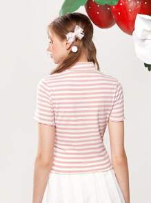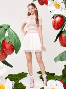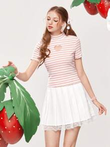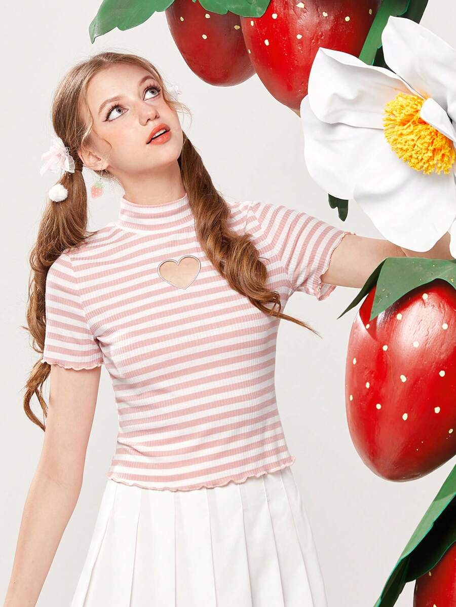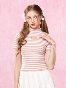 Kawaii Camiseta de rayas corazón recortado ribete en forma de lechuga de cuello alto
