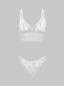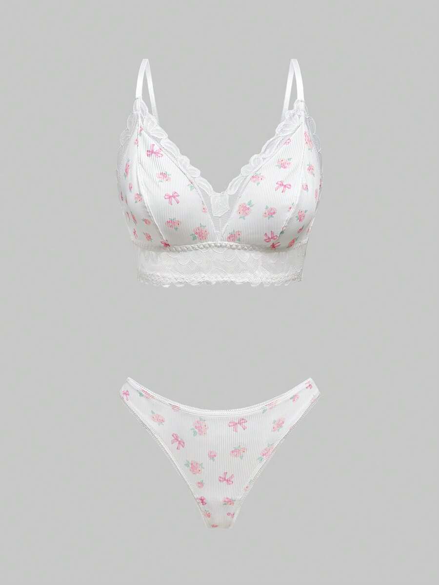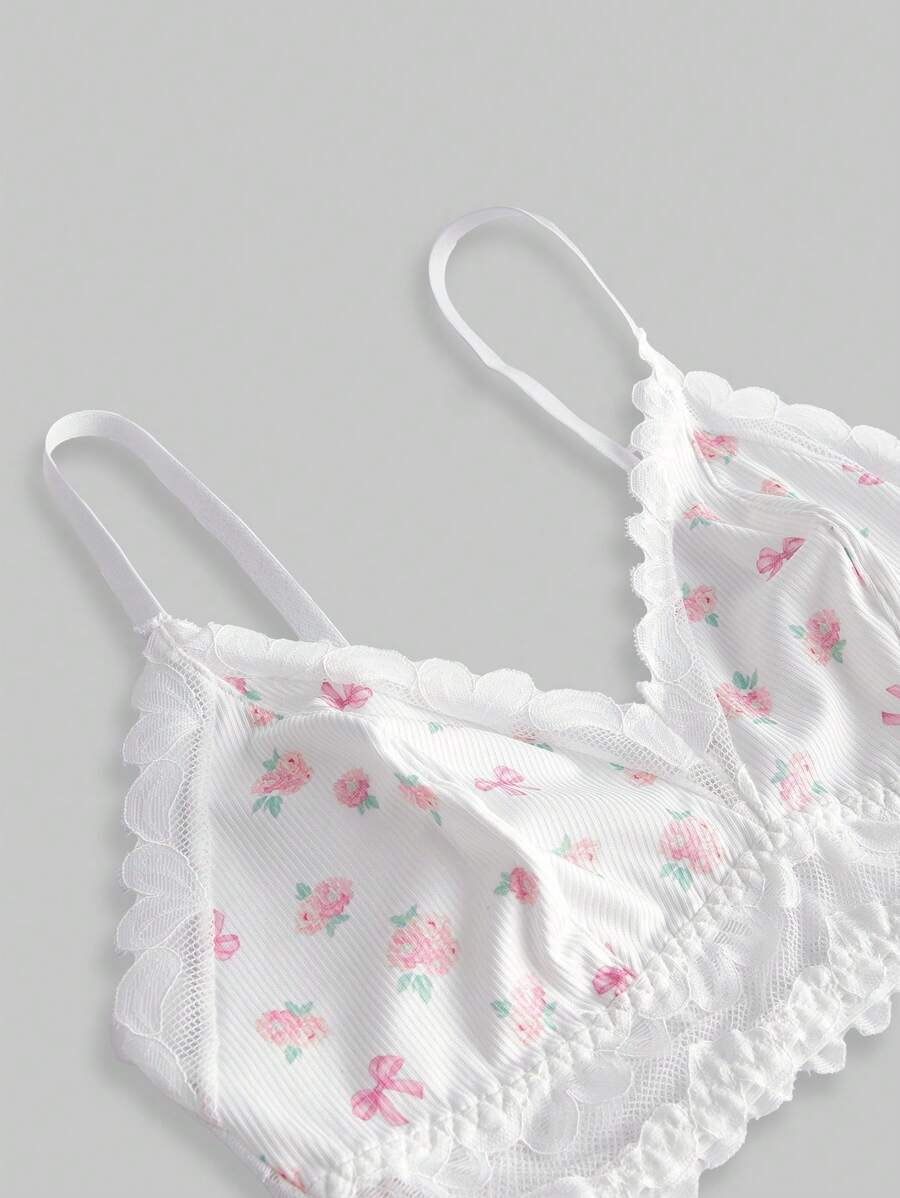 Kawaii Conjunto de lencería sin aros de encaje con estampado floral dulce y fresco para mujeres
