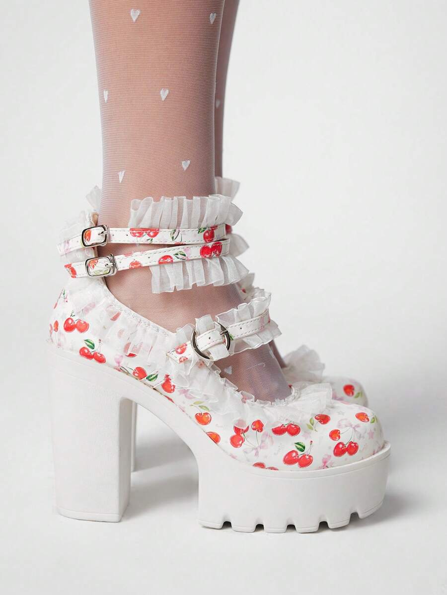 Kawaii Zapatos de tacón alto blancos, zapatos góticos con cierre de punta cerrada y ribete de encaje estilo Y2K, zapatos con tacón de bloque y correa a cuadros para vestido lolita, bailarinas con correa cruzada tipo Mary Jane, zapatos de uniforme escolar japonés JK, zapatos de tacón alto para mujer