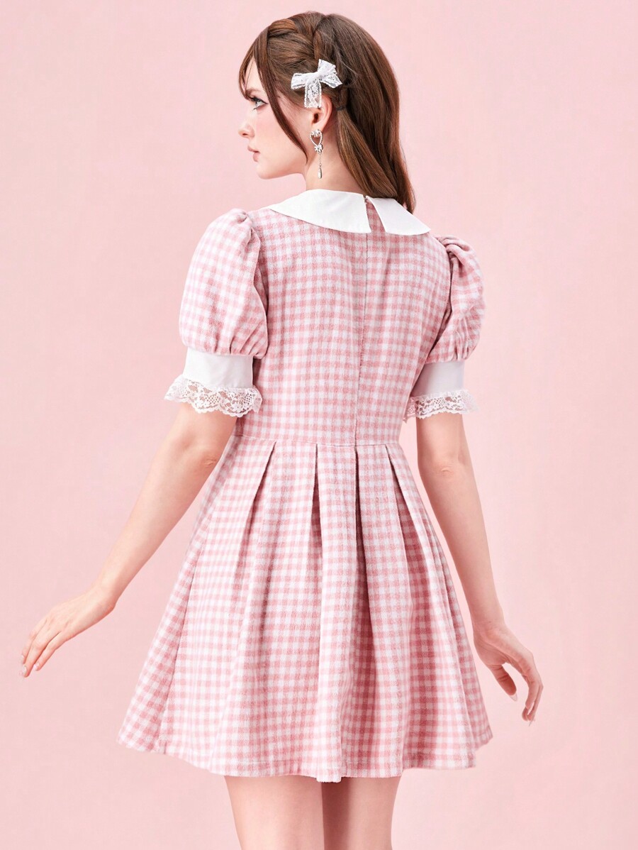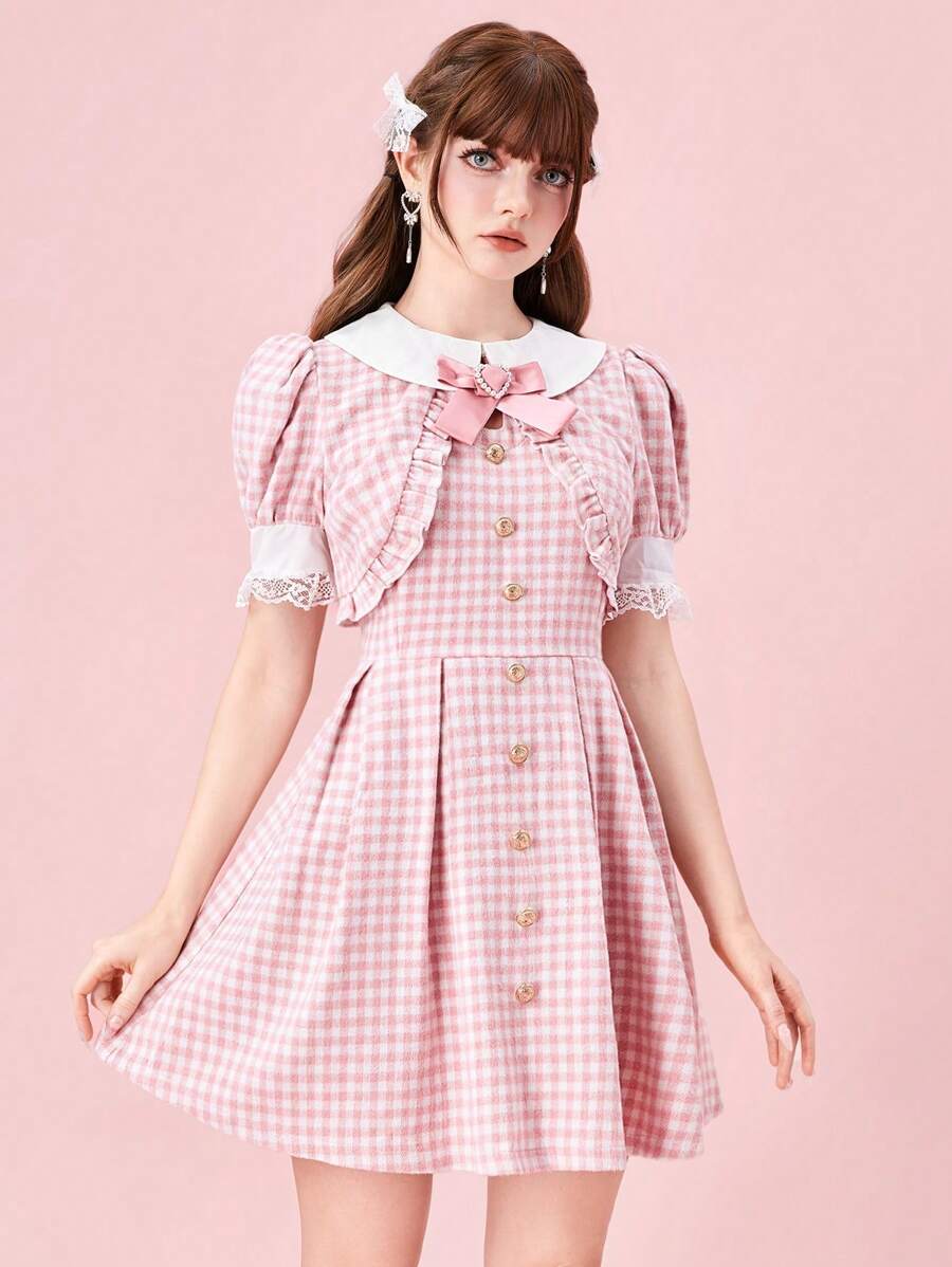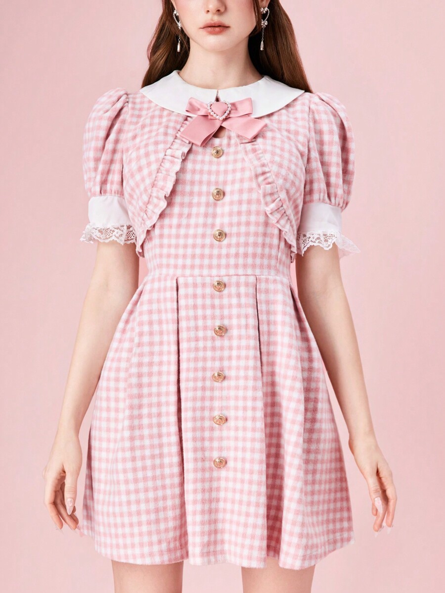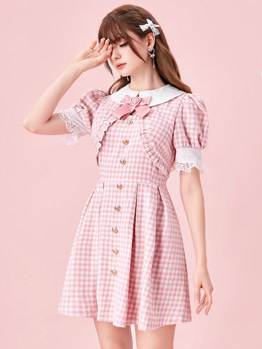 Kawaii Vestido mini a cuadros con botones delanteros, encaje de contraste y lazo para mujer, escolar