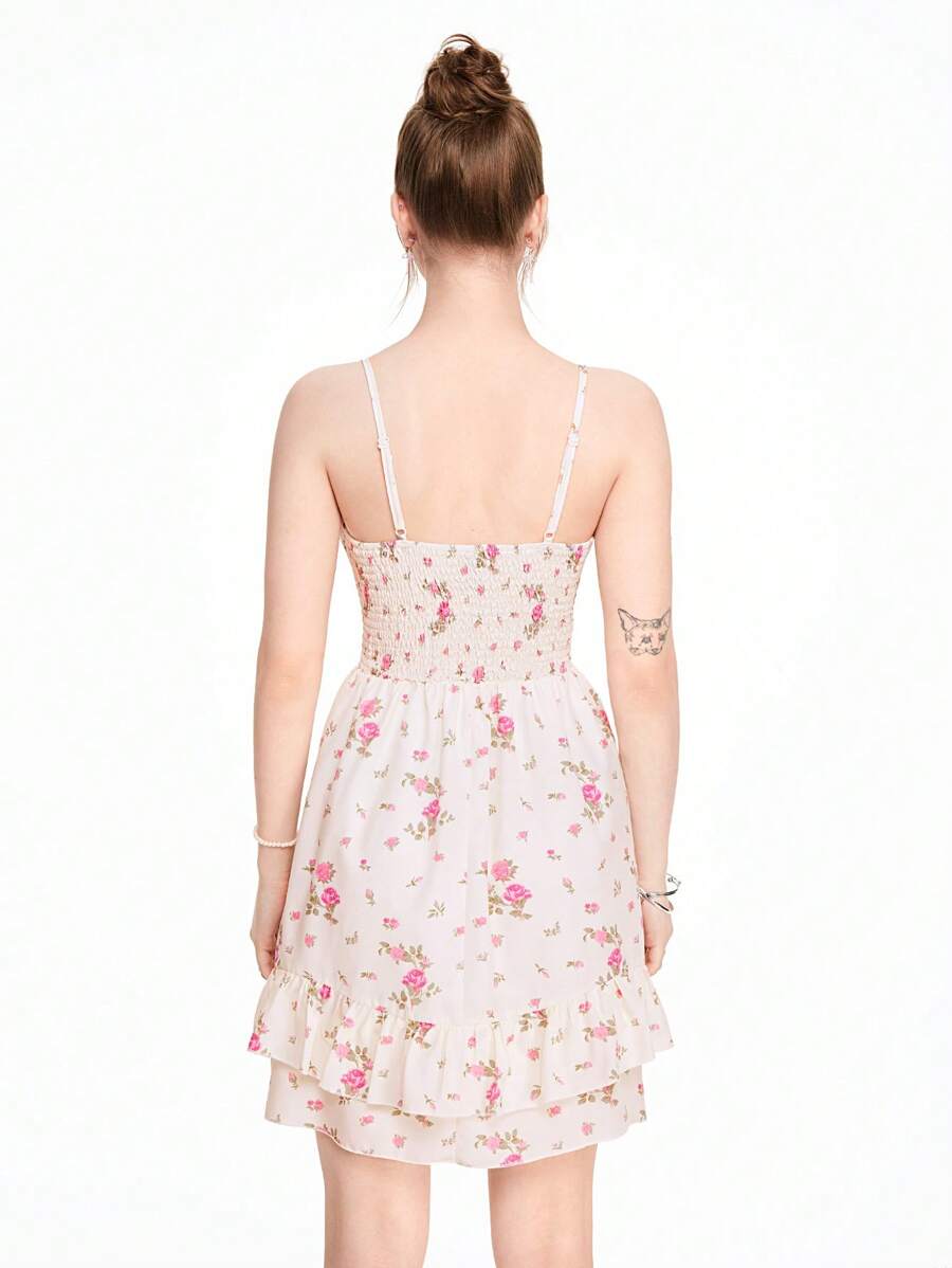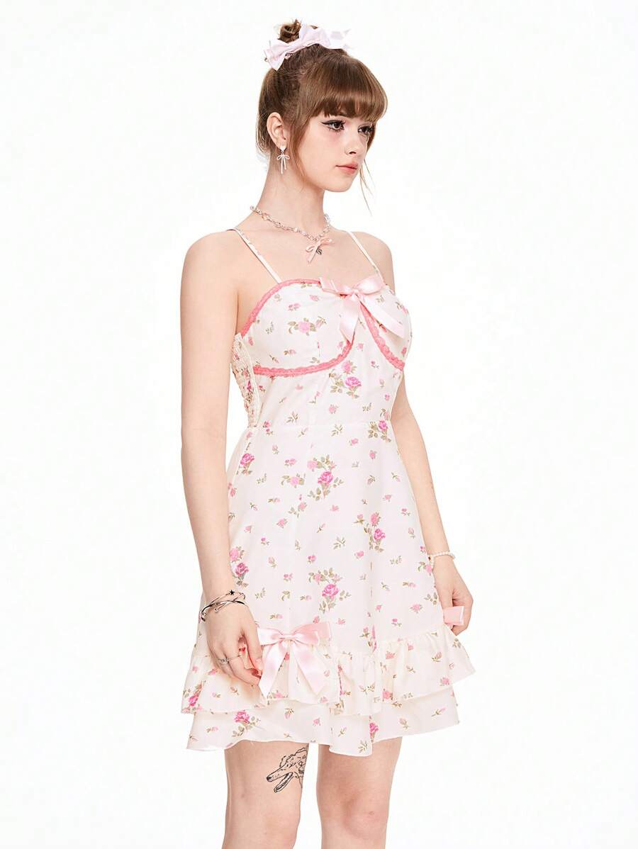 Vestido de cami con volantes en el bajo, estampado floral ditsy y encaje, estilo kawaii para mujer