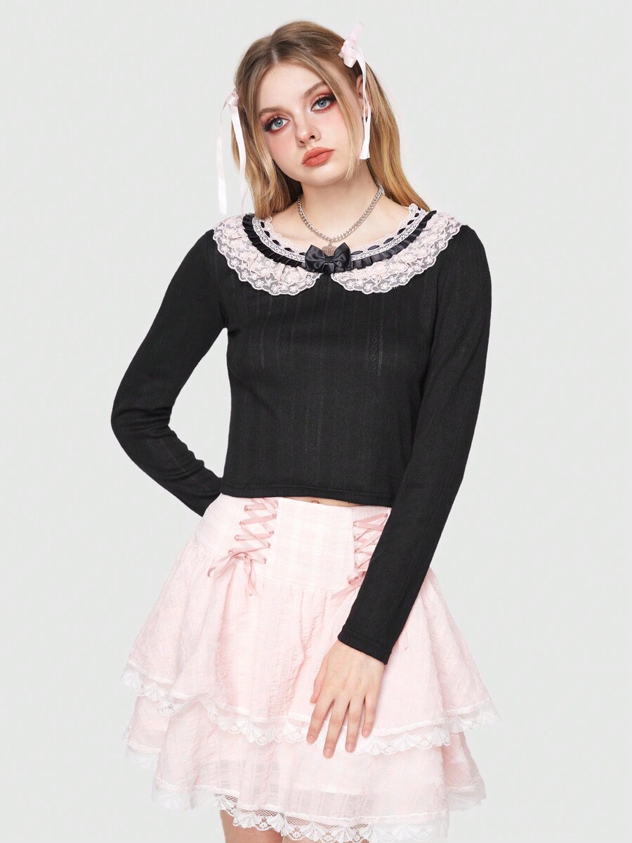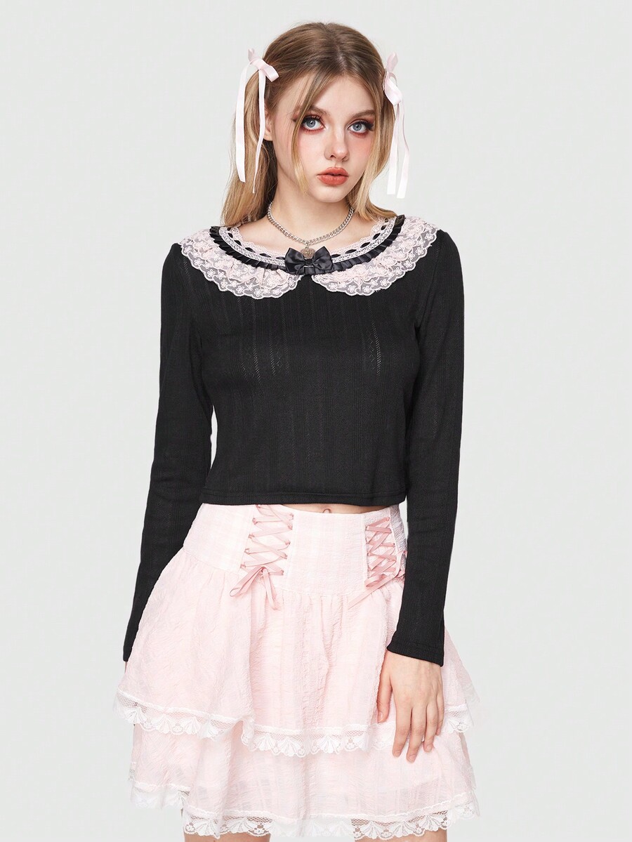 Kawaii Camiseta De Mujer Con Empalme De Encaje Y Lazo