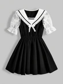 Kawaii Vestido De Cuello Marinero De Encaje Y Patchwork Para Mujer Con Bloque De Color