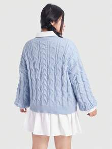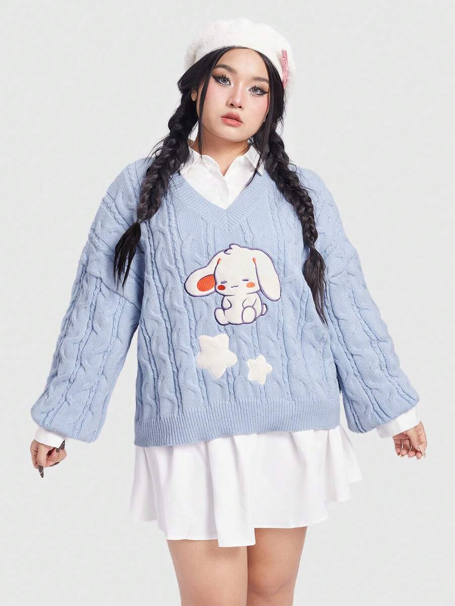 Kawaii Suéter Con Diseño Cartoon De Estrella Bordada Para Mujeres De Talla Grande, Tejido De Punto Cableado Con Cuello En V Y Hombros Caídos
