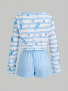 Kawaii Conjunto De Pijama De Rayas De Manga Larga Para Mujer Y Pantalones Cortos