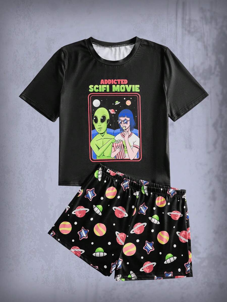 Lasthopeparty Conjunto de pijama shorts con camiseta con estampado de extraterrestre