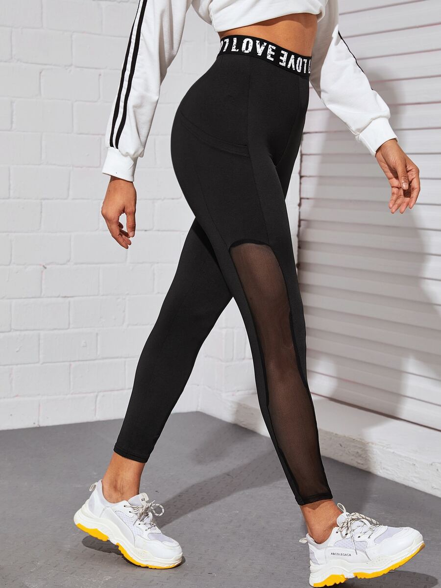 Leggings con malla en contraste con cinta con letra y dibujo