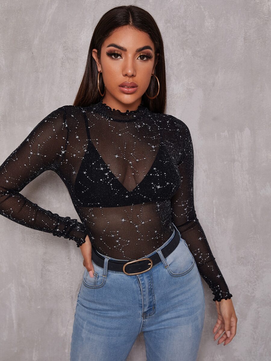 Top con malla brillante borde en forma de lechuga sin sujetador