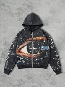 Street Life Sudadera con capucha con cremallera, cordón y forro térmico con estampado de letras y ojos para hombre, otoño/invierno
