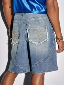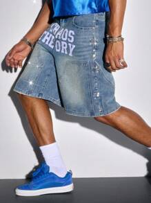 Street Life Pantalones cortos de carga de mezclilla con bordado de rhinestones para hombres