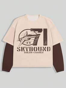 Street Life Camiseta de manga larga con cuello redondo y estampado de letras 2 en 1 para hombre