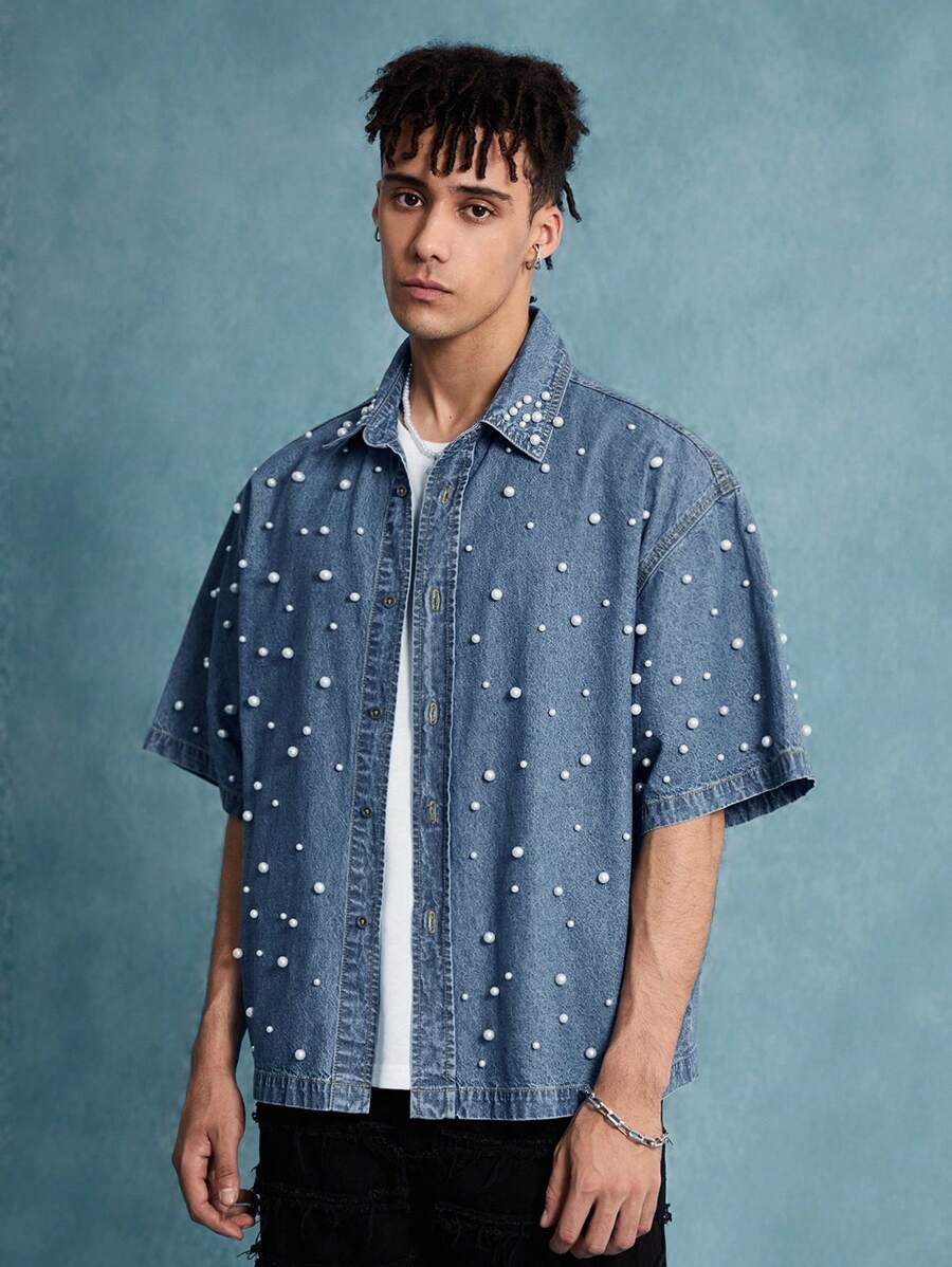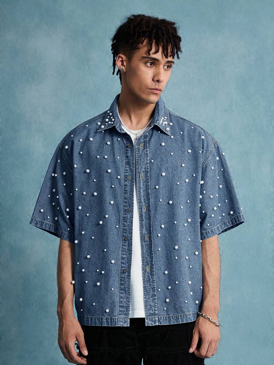 Street Life Camisa vaquera casual de hombre con detalles de remaches decorativos desgastados