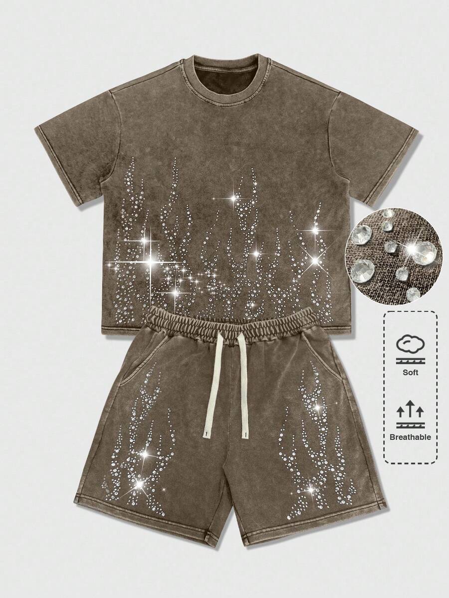 Street Life Conjunto de camiseta y pantalones cortos de moda de verano para hombres con llamas y rhinestones