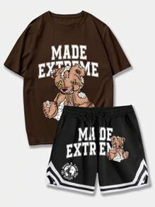 Street Life Hombres Camiseta Gráfica Con Dibujo De Oso Y Letras + Pantalones Cortos Con Detalles De Rayas