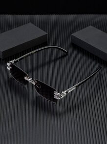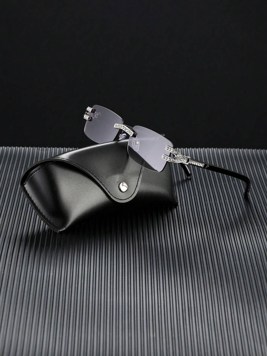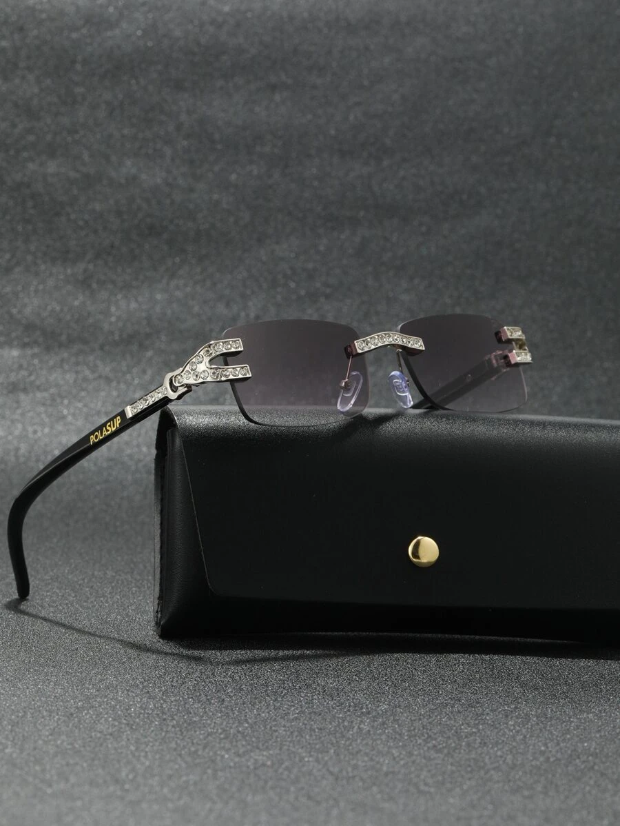 1 pieza Gafas de moda decorativas con diamantes de imitación sintéticos de POLASUP, lentes degradadas de material PC sin montura de estilo lujoso y único con correa antiperditaincluida, estuche y paño de limpieza para verano, playa, al aire libre y viajes