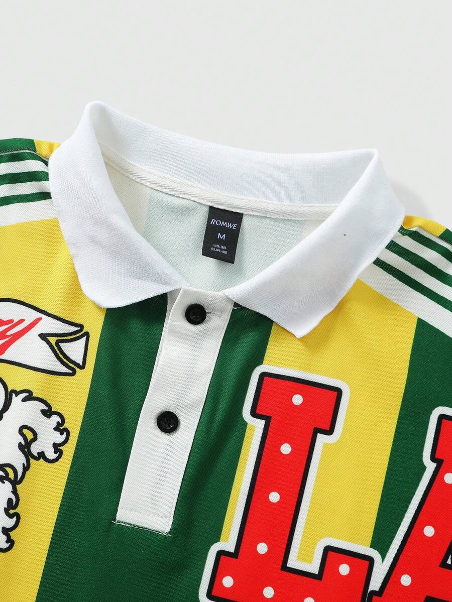 Polo para hombre, estilo universitario casual americano a rayas con estampado en inglés de manga corta