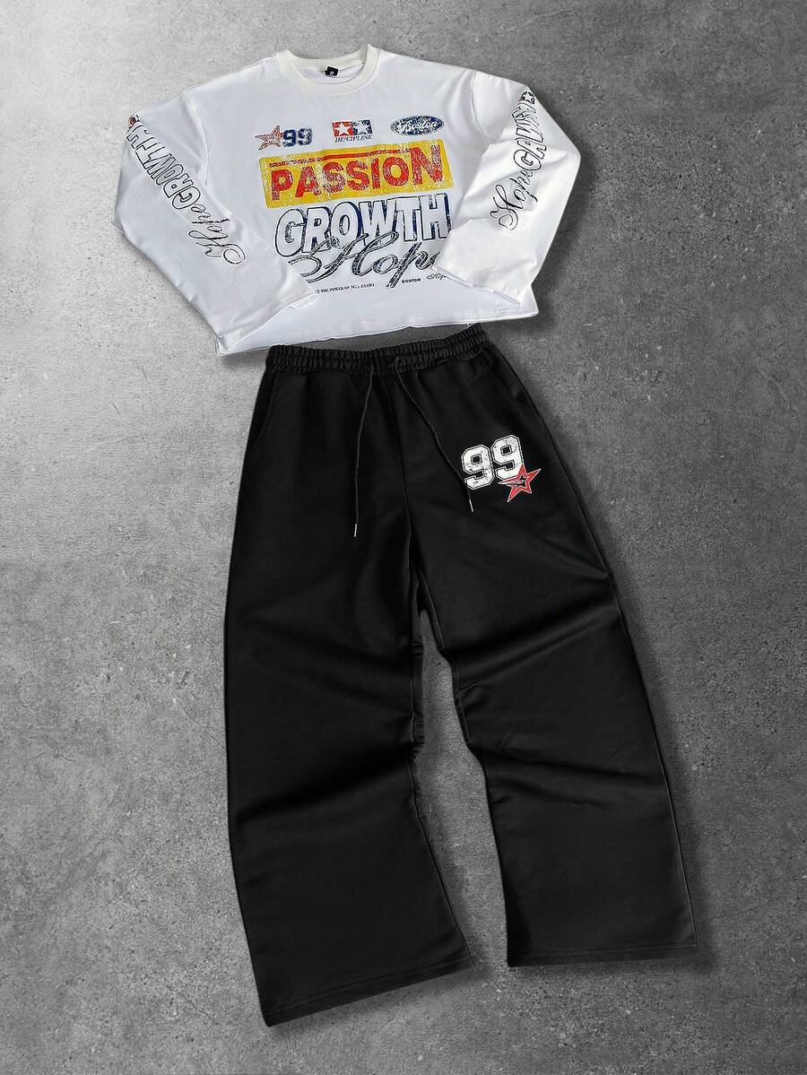 Conjunto de top de manga larga con cuello redondo estampado y pantalón de chándal para hombre
