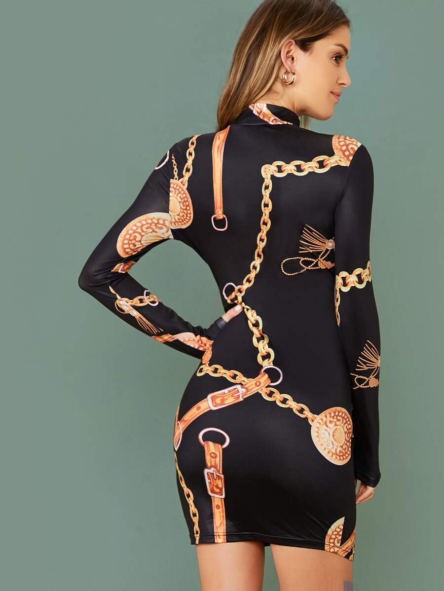 Vestido ajustado con estampado de cadena de cuello alto